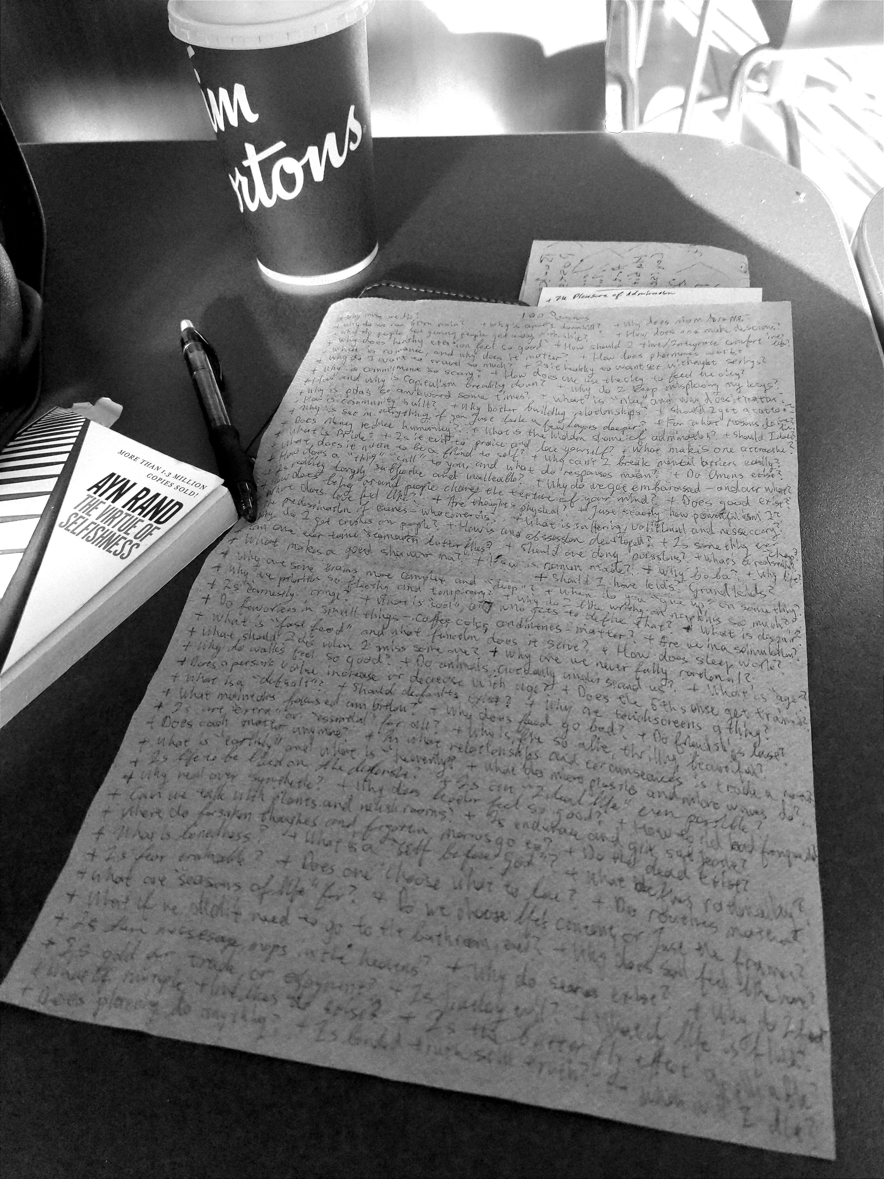 I did Leonardo Da Vinci’s little “curiosity exercise” at a Tim Horton’s yesterday: I covered the back of a napkin with 100 questions in one sitting. A neat experience, rather calming, and potentially eye-opening. Recommended! I had my students do this as part of yesterday’s class, as most of them enjoyed it — one directed all his questions to God, which is a cool twist on the exercise. The napkin in question:
