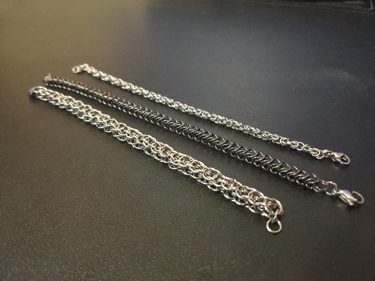 I’m falling in love again with chainmail jewellery making. The furthest/slimmest chain was my first bracelet, made 11 months ago. The dark one in the middle was completed last month; the chunky-looking chain in front was my main project this past week. Currently struggling with getting the hang of a couple other patterns!